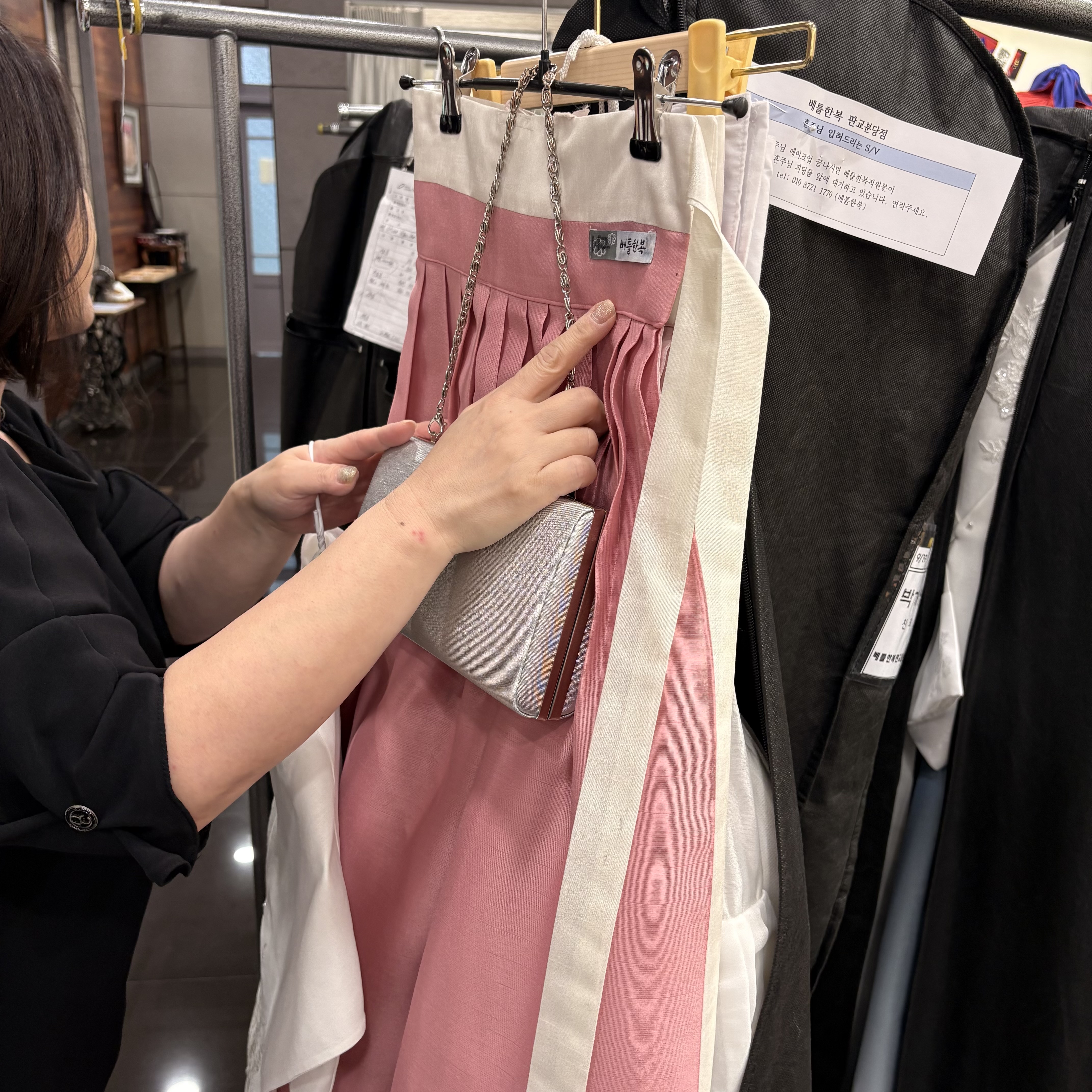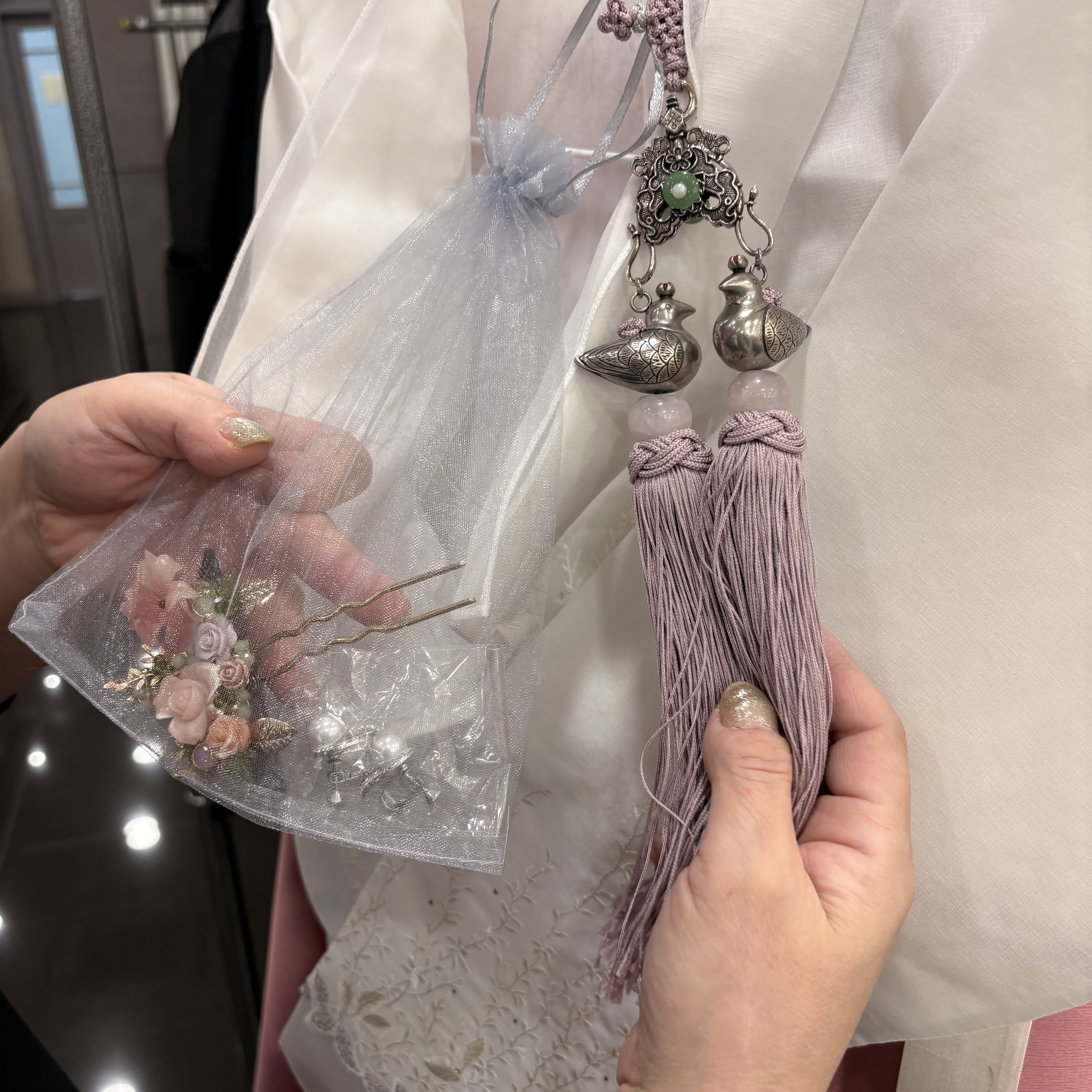 본식 전날에는 한복뿐만 아니라 핸드백, 노리개, 뒤꽂이, 귀걸이, 속치마, 신발까지 올인원으로 준비해주셔서 따로 챙길 게 없었어요. 모든 구성품을 큰 옷가방에 정리해 담아주셨고, 이름과 체크리스트가 붙어 있어 혼동 없이 준비할 수 있었습니다. 작은 디테일까지 신경 써주는 느낌이라 정말 좋았어요.