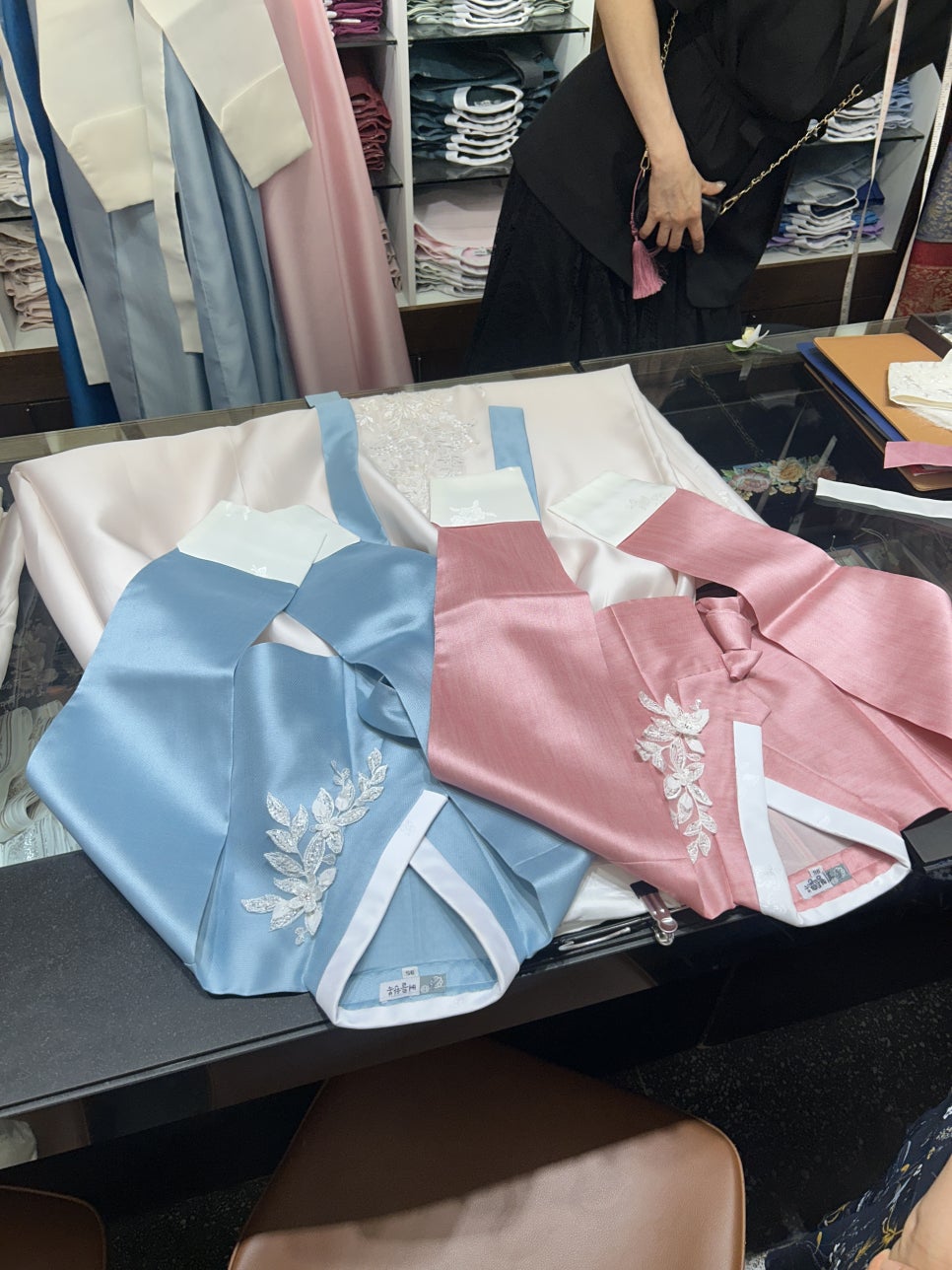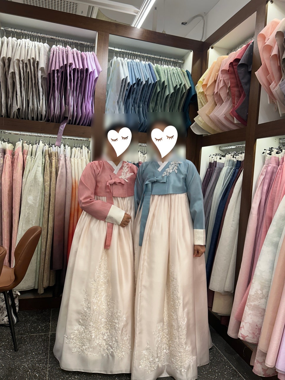 예쁜 자수가 치마폭에 놓아져 있어서 단아하면서도 화려했고, 위 저고리도 뮤트톤 / 밝은톤 모두 입어보고