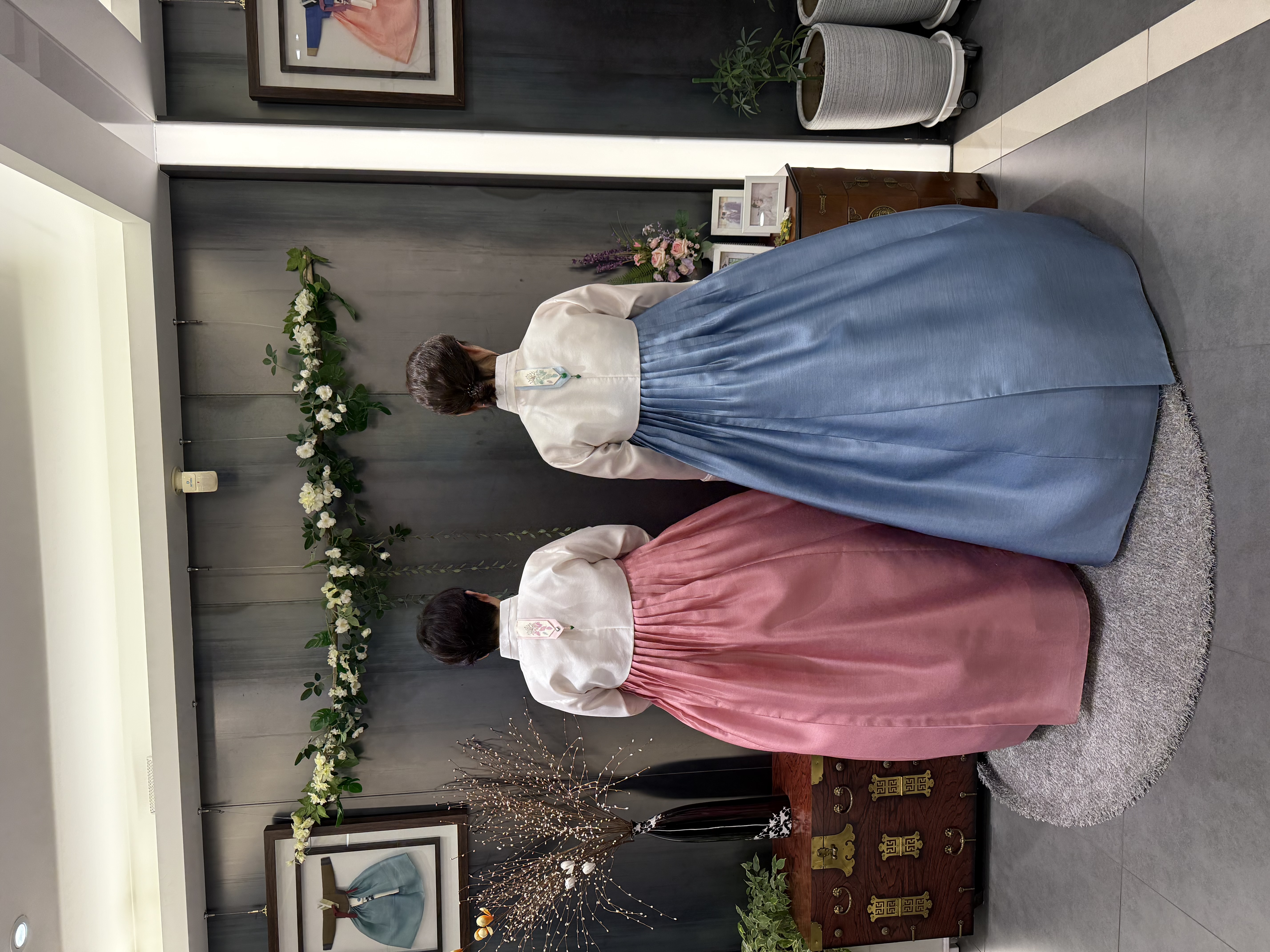 첫번째로 입어본 한복은 핑크+블루 조합이었어요.