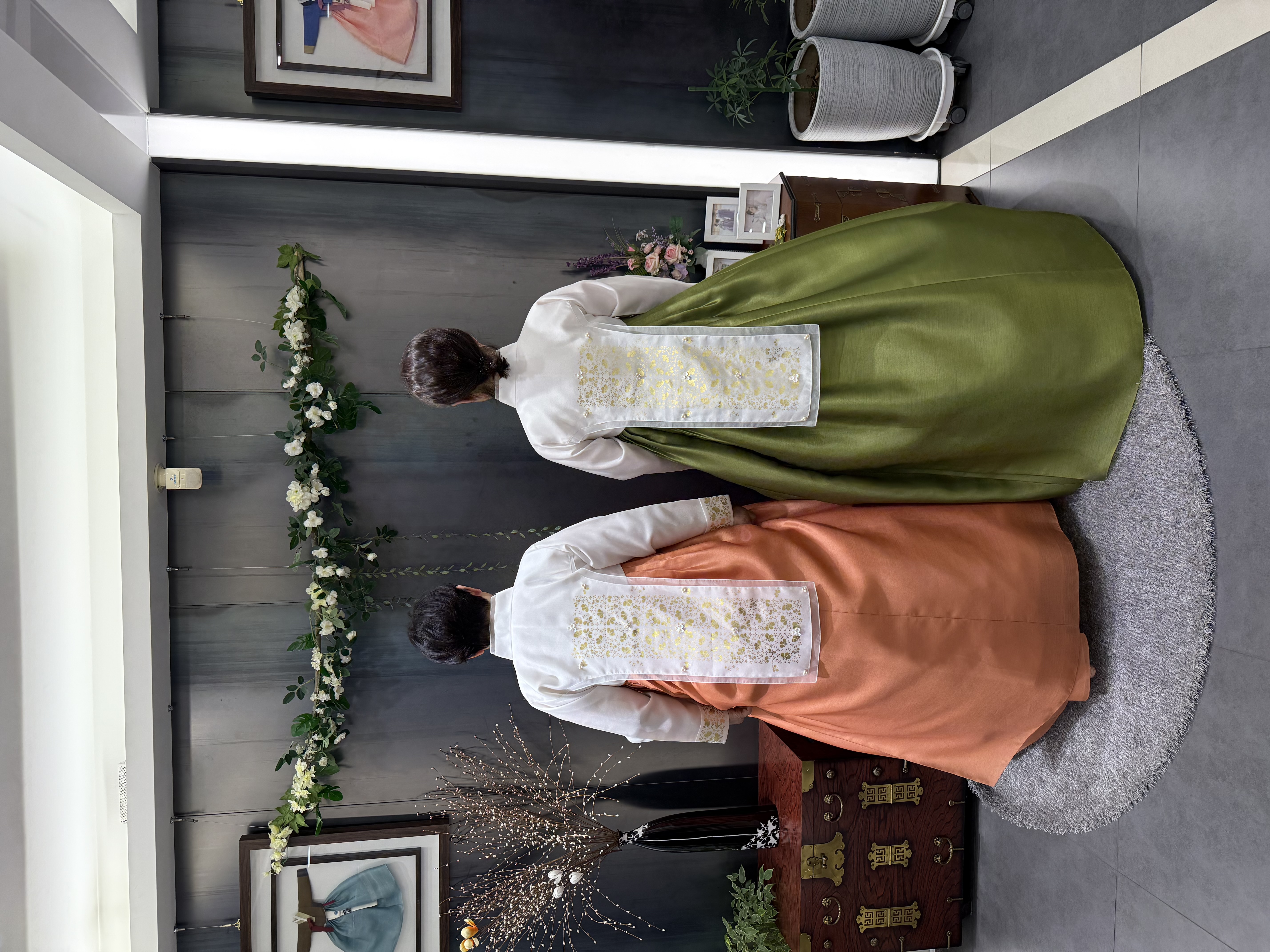 오렌지+올리브그린 조합을 입어봤는데 색다르기도 하고 양가 어머님들 피부톤과 찰떡으로 어울렸어요.