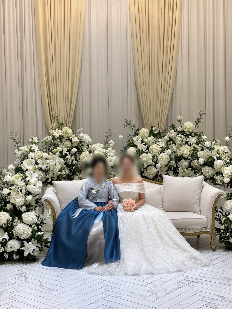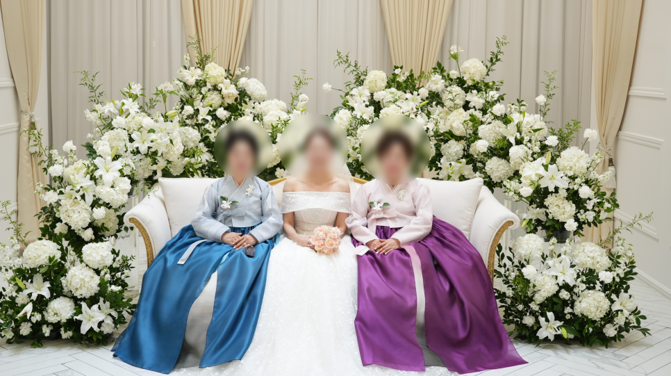 저희는 총 세 벌의 한복을 시착하며 거울 속 우리의 모습을 보았습니다. 저마다의 매력이 있었지만, 두 번째로 입어본 한복을 입었을 때 우리는 서로를 향해 행복한 웃음을 터뜨렸습니다. "바로 이 옷이네요."라는 말이 동시에 나올 정도로, 그 한복은 예식장인 여의도 웨딩컨벤션 호텔의 분위기와도, 저희 부부와 양가 어머니의 이미지와도 완벽하게 조화를 이루었습니다. 신랑과 신부가 커플 한복 세트를 입지는 못했어도, 각자의 한복이 서로를 보완하며 아름다운 앙상블을 만들어냈습니다. 어머님들의 만족스러운 눈빛을 보며 저희는 주저 없이 이곳에서의 대여를 결정했습니다.