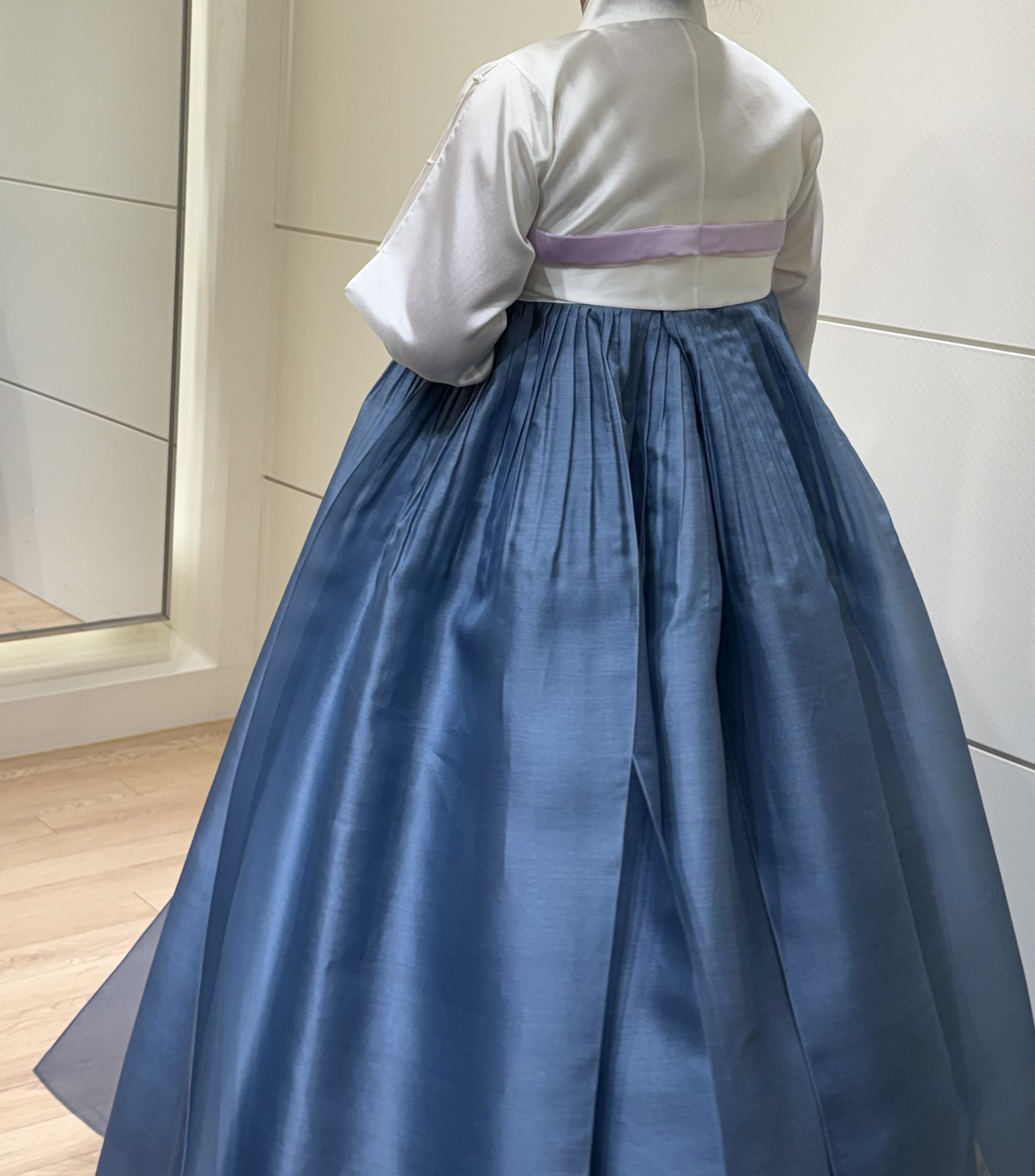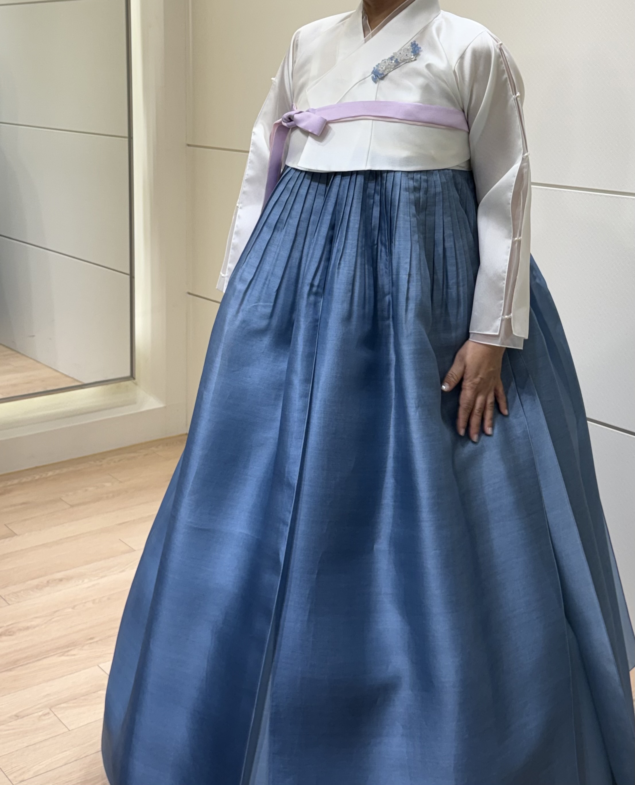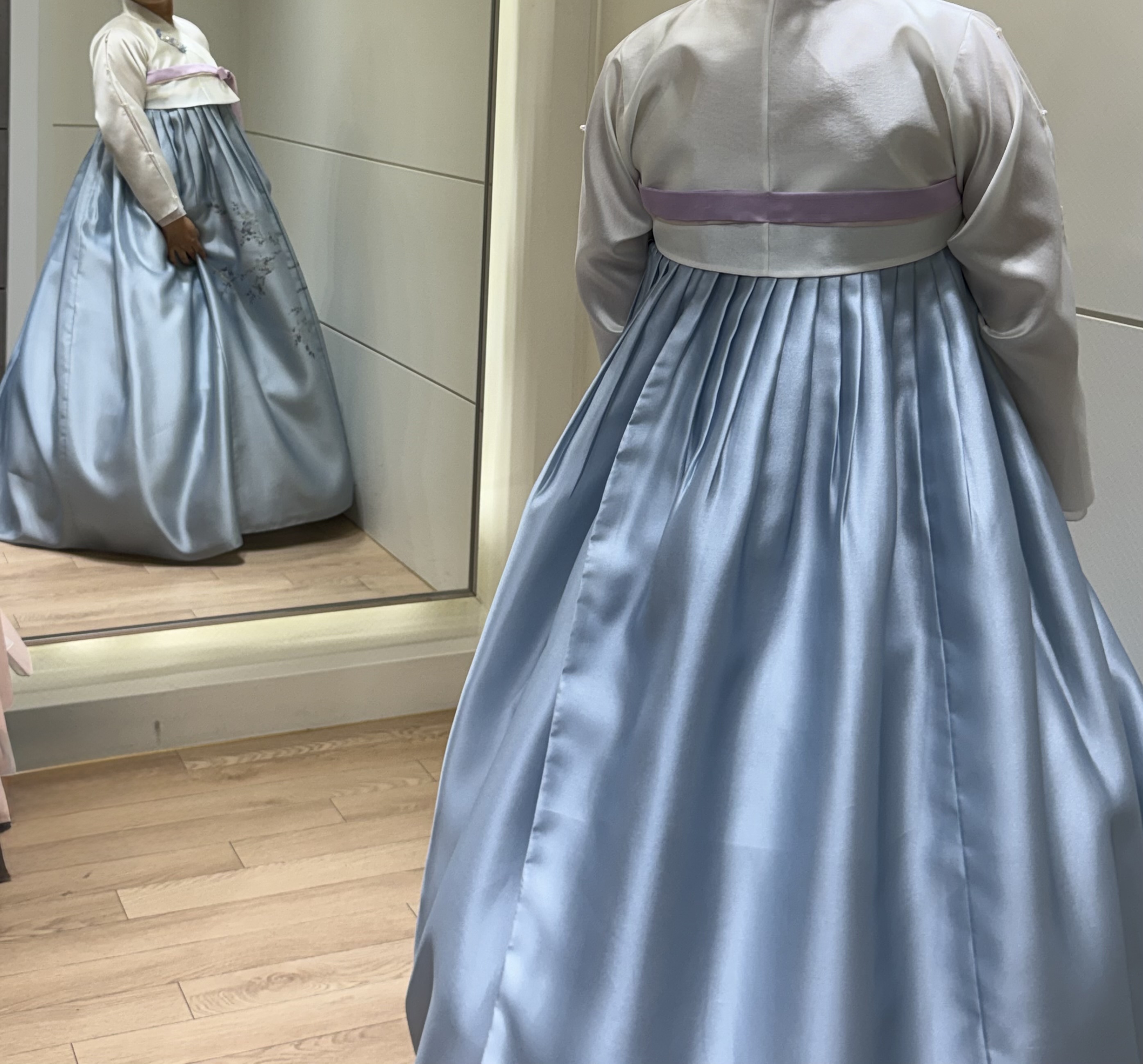 제가 고름 색, 치마 컬러, 겉치마까지 이것저것 요청을 많이 드렸는데도 하나하나 다 반영해 주셔서 감사했어요. 같은 컬러라도 얼굴톤에 따라 느낌이 완전히 달라서 혼주 한복이 왜 어려운지 직접 가보니 알겠더라구요.