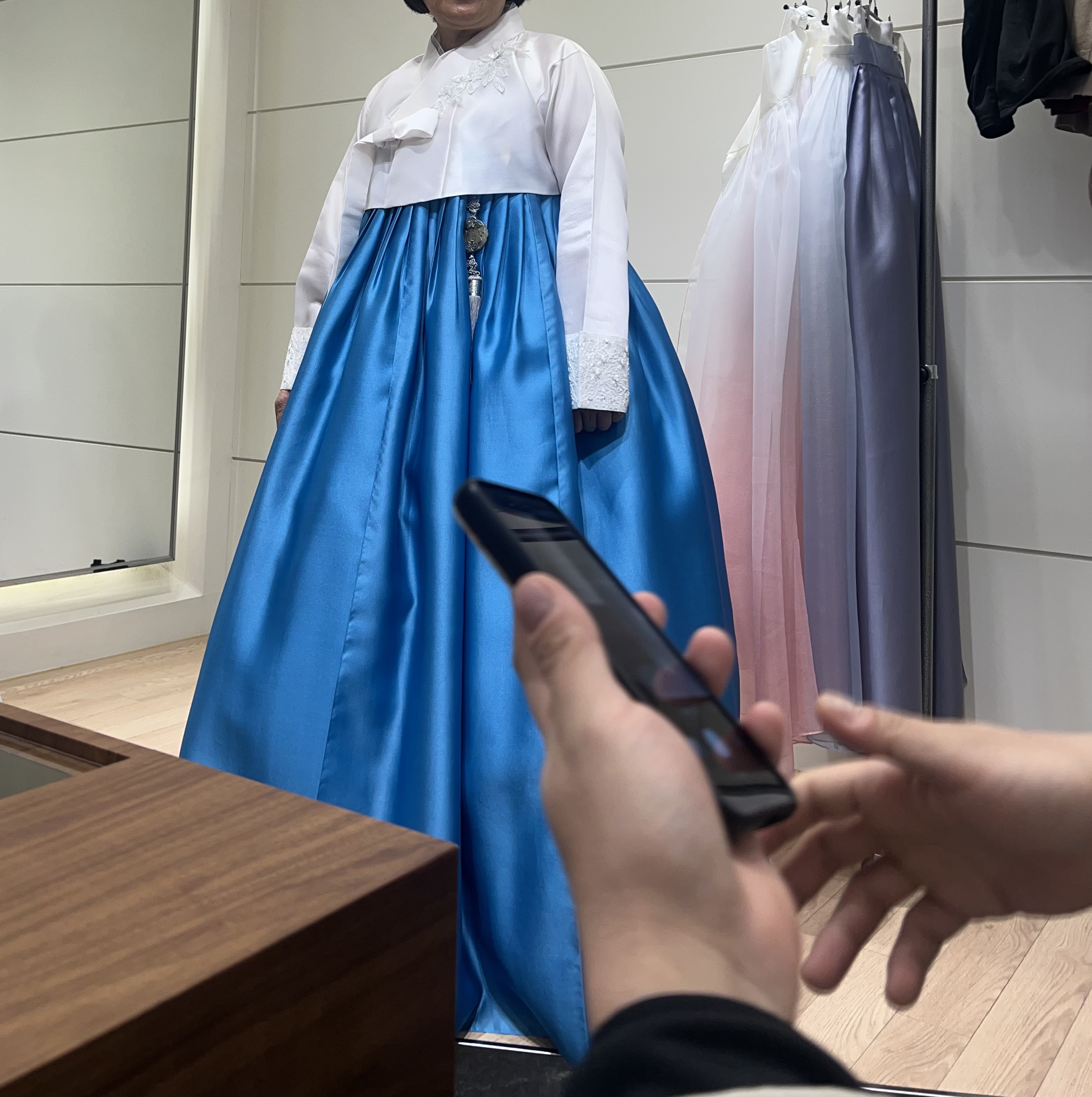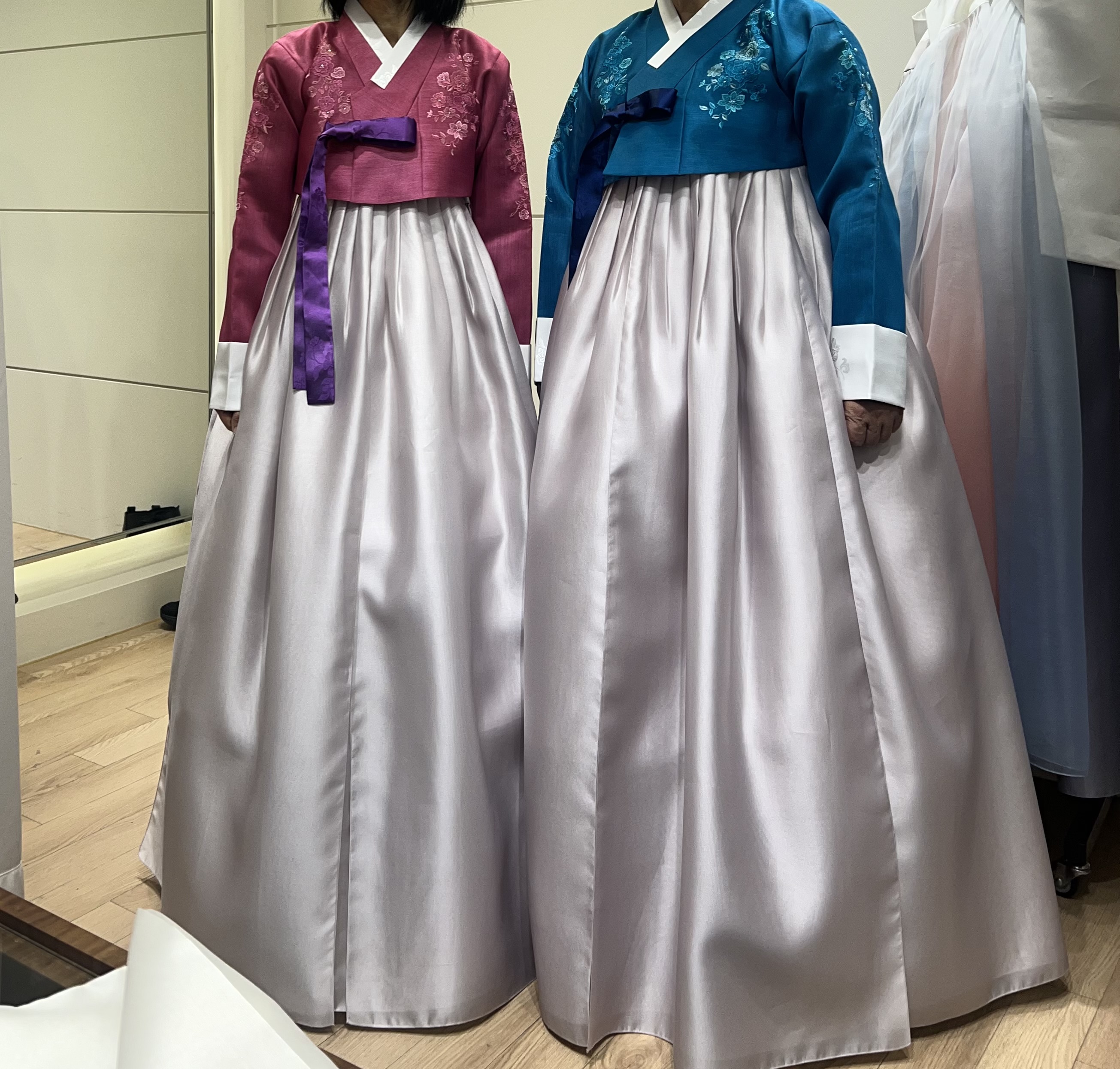 한복 원단, 색감, 디자인 차이까지 하나하나 비교해주시면서 이해하기 쉽게 설명해주셨고, 어머님들 취향을 빠르게 파악해서 추천해주시는 모습이 정말 인상적이었어요. 한 분은 화려하고 우아한 스타일을, 다른 한 분은 단아하고 수수한 느낌을 원하셔서 색감과 분위기에서 의견이 조금 갈렸는데, 그 중간에서 자연스럽게 조율해주시면서 두 분 모두 만족하실 수 있는 방향으로 이끌어주셨어요. 덕분에 분위기도 좋게, 기분 좋게 계약까지 마무리할 수 있었습니다.