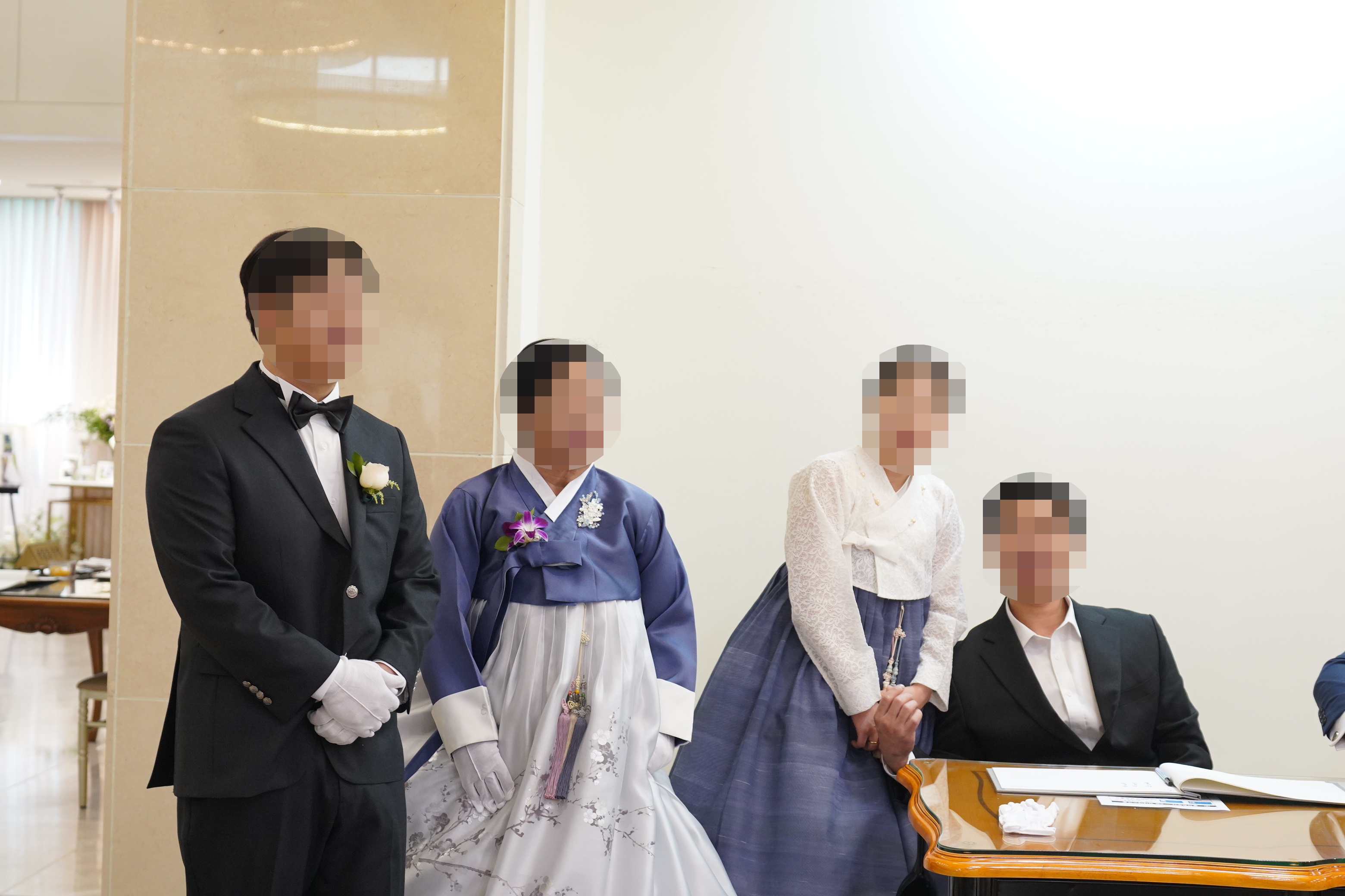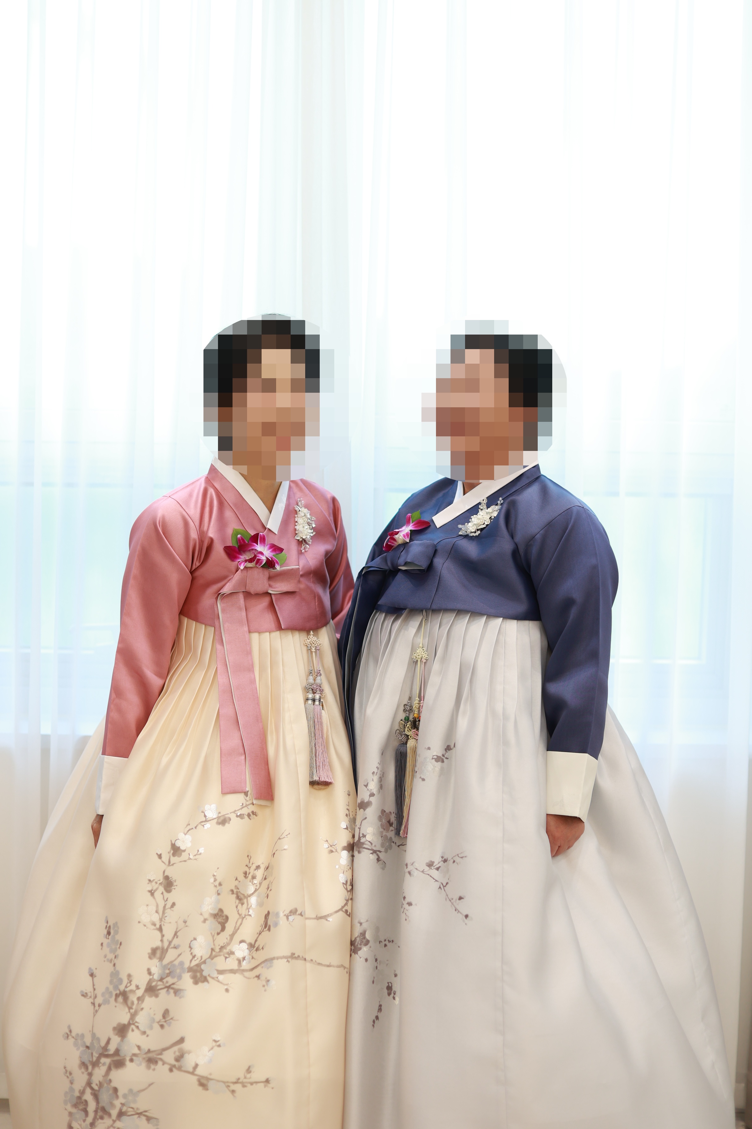 대여임에도 불구하고 소매 끝단 하나, 깃의 각도 하나까지 세심하게 체크해 주신 덕분에 네 분 모두 예식 내내 "맞춤 한복을 입은 것처럼 몸에 착 감기고 편안하다"며 입을 모아 칭찬하셨습니다.