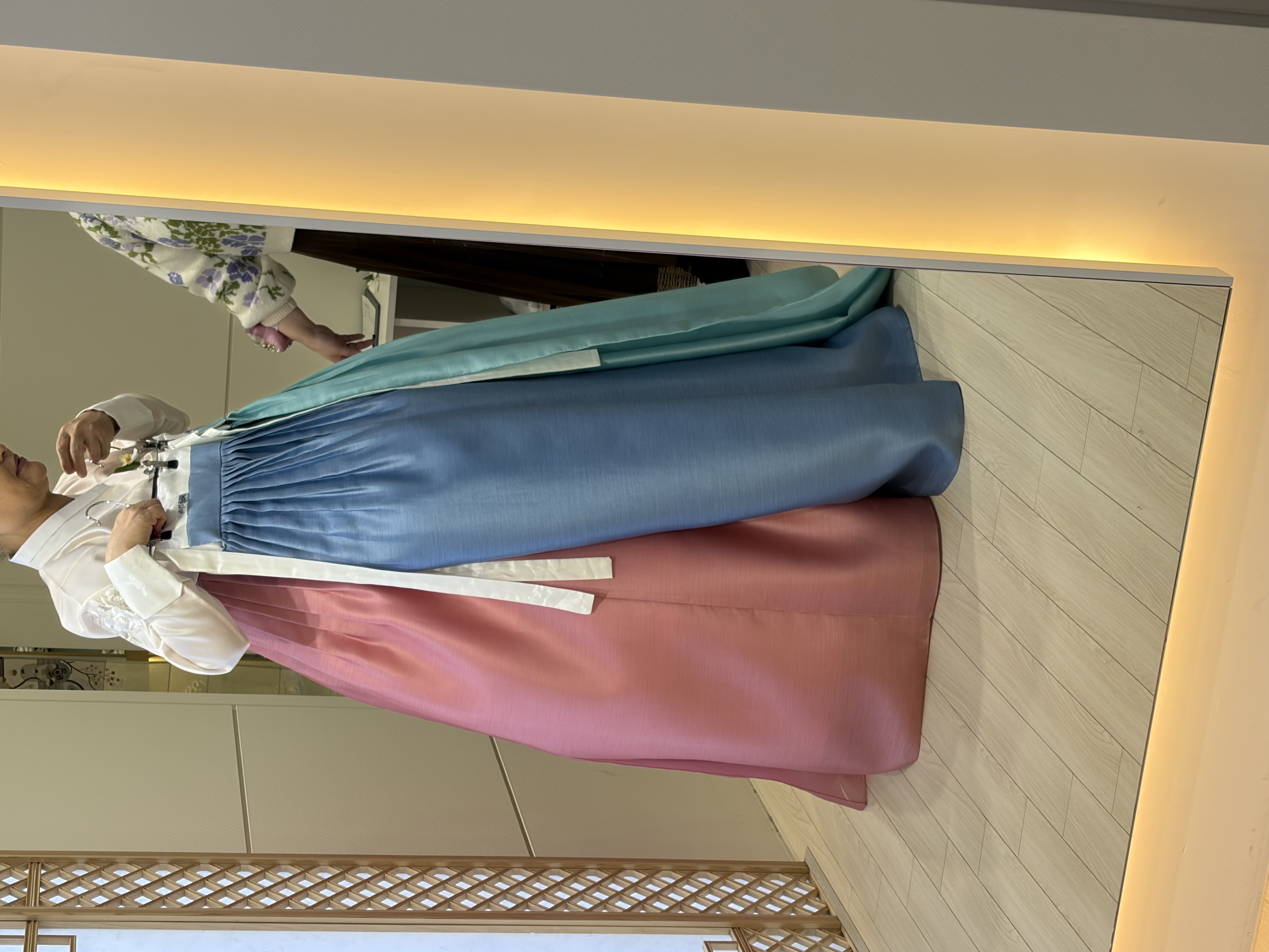 실제로 입어보니 한복의 소재가 고급스럽고 색감도 과하지 않으면서 단정해서 혼주 한복으로 잘 어울린다는 느낌을 받았습니다. 사진으로 보는 것과 직접 착용했을 때의 느낌이 확실히 달랐고, 부모님도 거울을 보시며 만족해하시는 모습이 인상적이었습니다. 색상 조합도 여러 가지로 비교해주시며 차분하게 설명해주셔서 선택이 한결 수월했습니다.
