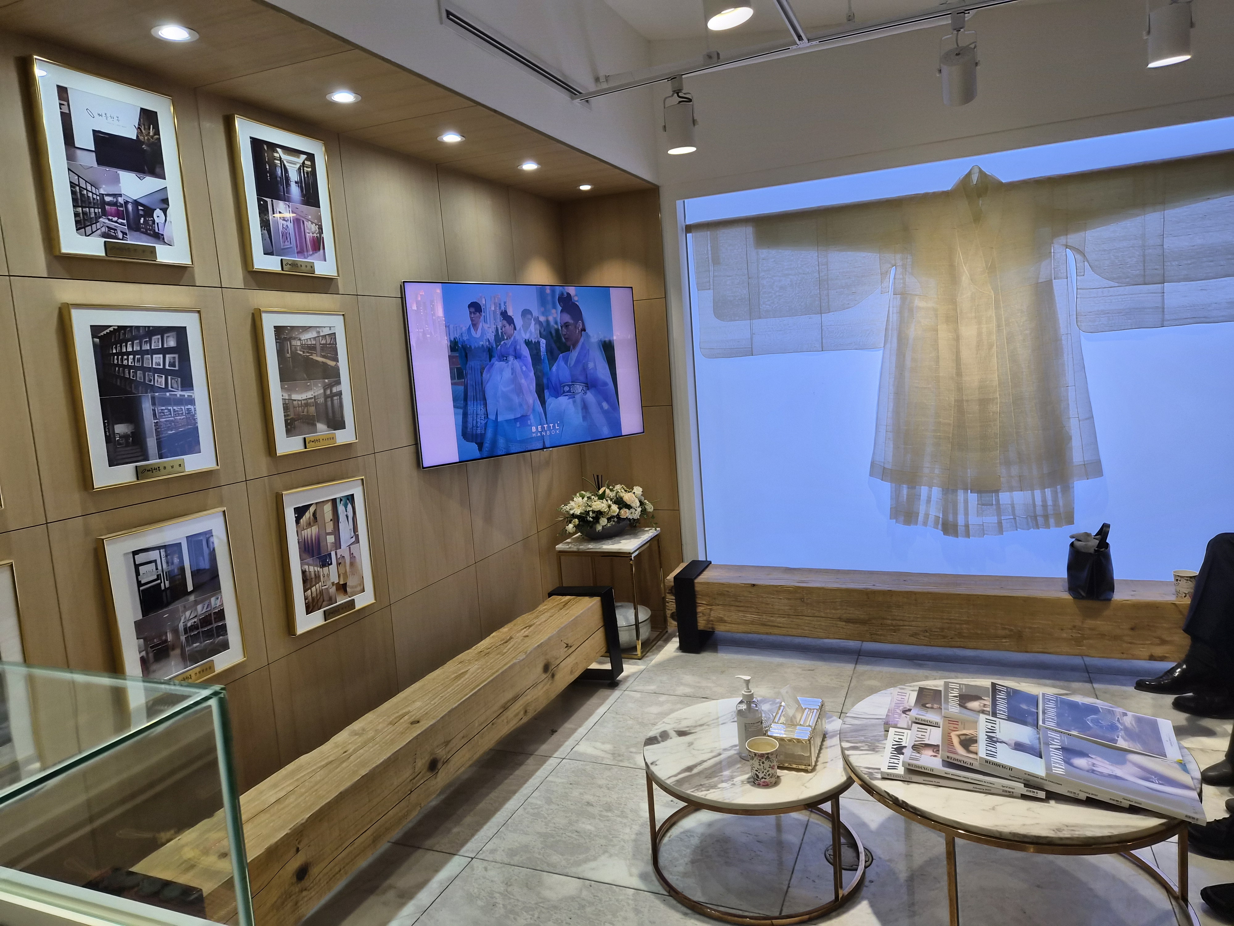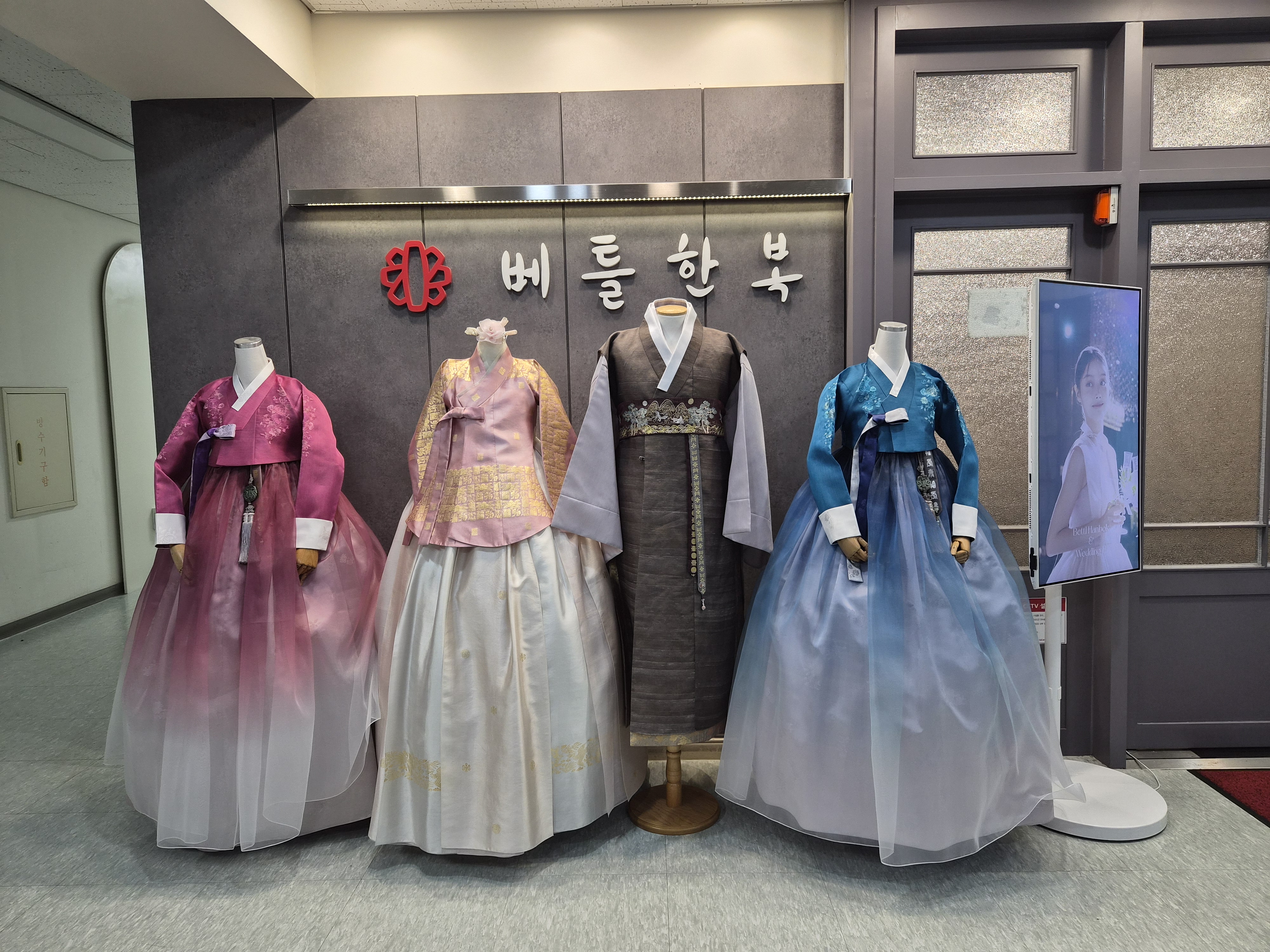 그래서 직접 상담을 받아보고 싶어서 베틀한복 강남점에 방문하게 되었어요. 매장에 들어가자마자 느낀 건 생각보다 공간이 넓고 한복 종류가 정말 다양하다는 점이었습니다. 혼주한복뿐만 아니라 신랑신부 한복도 피팅된 모습으로 전시되어 있었는데, 실제로 보니 사진보다 더 고급스럽고 색감이 예쁘더라고요. 순간 “예산만 괜찮다면 신부 한복도 하고 싶다”는 생각이 들 정도였습니다.