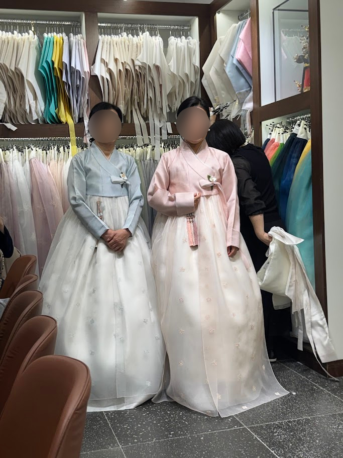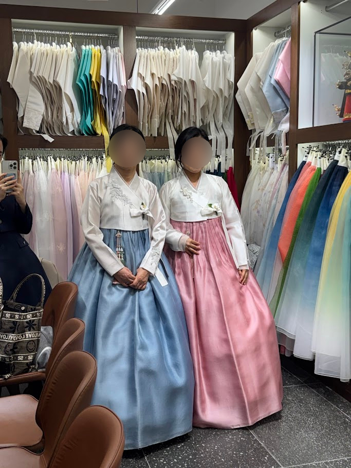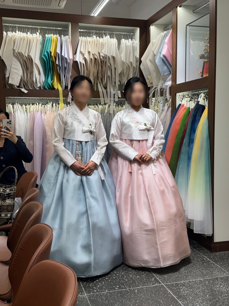처음엔 태블릿으로 다양한 스타일을 먼저 살펴본 뒤, 담당 실장님께서 예식 계절감과 어머님들 연령대, 피부 톤을 고려해 찰떡같은 조합을 추천해 주셨습니다. 저고리와 치마를 바꿔가며 4번 정도 피팅해 보았는데, 귀찮은 내색 없이 노리개와 비즈 장신구 하나하나까지 세심하게 세팅해 주시는 모습에 정말 감동했습니다.