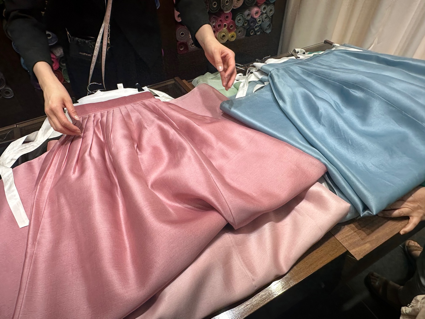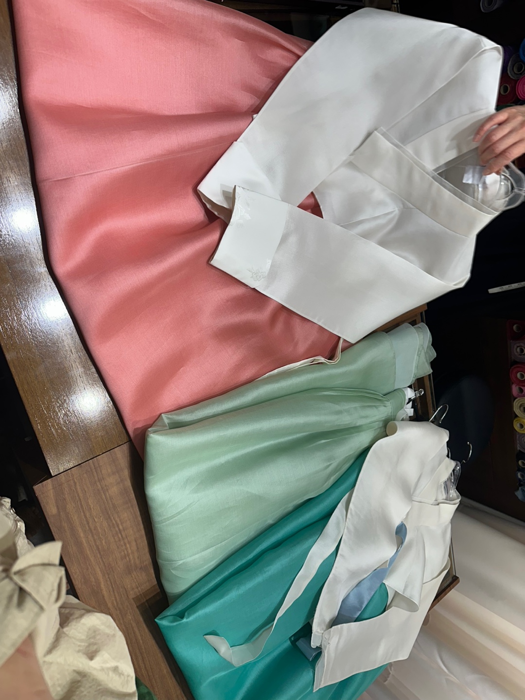 상담해주신 분께서 어머님들의 취향을 빠르게 파악하시고, 연령대와 체형, 선호 색감에 맞춰 3~4벌 정도로 추천해주셨습니다. 저희 어머니들은 전통 갈래치마보다는 통치마 스타일을 선호하셨는데, 촌스럽지 않으면서도 세련된 색감으로 부드럽고 은은한 톤의 원단을 보여주셨습니다. 실제로 조명 아래에서 보니 색감이 정말 예뻤고, 사진보다 훨씬 고급스러웠습니다.