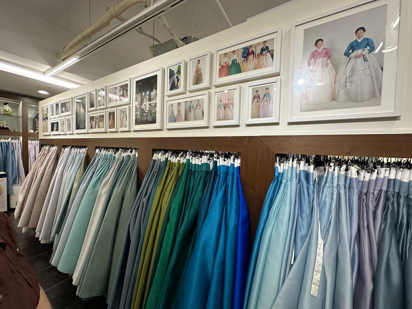 상담실로 들어가니 색상과 원단 종류가 정말 다양했습니다. 한복에 대해 잘 몰랐던 저조차도 여러 원단을 직접 만져보고 비교해보니 흥미가 생기더군요. 드레스샵보다 훨씬 넓은 공간에 한복이 가득 진열되어 있어서 눈이 휘둥그레졌습니다. 상담 부스는 개별로 분리되어 있어 다른 손님들과 마주칠 일 없이 프라이빗하게 피팅할 수 있었고, 조용하고 아늑한 분위기라 어머님들도 편안해하셨어요.